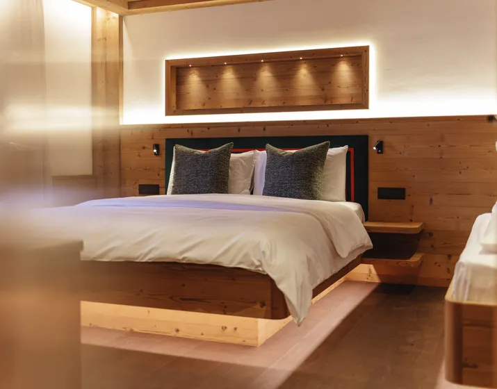 Die Junior Doppelzimmer sind sehr einladende und luminöse Zimmer. Im Natur Stil möbliert und mit eigenem Badezimmer mit Dusche, WC, Bidet und Haartrockner ausgestattet. Unsere Junior Doppelzimmer sind alle Mansardiert und mit Holzboden ausgelegt und bieten einen Blick auf den Sellastock und Plan de Gralba. Zur Ausstattung gehören Schreibtisch, Telefon, WLAN, Sat-TV und Safe. Ideal für 2-4 Personen, Kapazität von ca. 30m².
